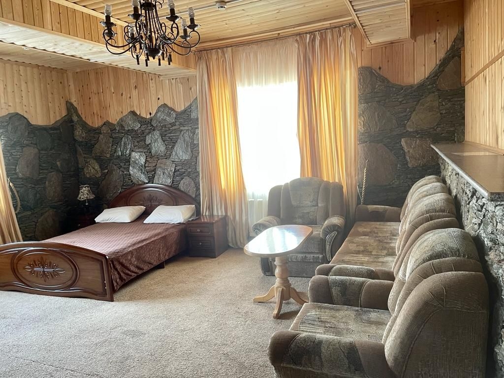 Номер категории «Комфорт четырехместный» — Двуспальная кровать, раскладной диван и два раскладных кресла. Шкаф, тумбочки, стол, стулья, холодильник, телевизор окна выходят на поляну, отдельный вход. Отдельная душевая, отдельный с/у.
